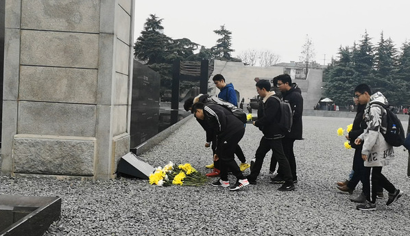 同学们在南京大屠杀纪念馆烈士名单石碑前汇集,依次为遇难的同胞们献上一束束菊花,之后同学们默然肃立,神情凝重地为不幸遇难的30万同胞默哀一分钟。随后,所有同学进入纪念馆内瞻仰学习,通过一幅幅照片、一段段史料视频,了解那段沉重的历史。