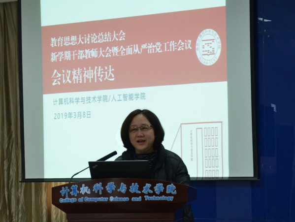 3月8日下午,计算机科学与技术学院/人工智能学院在学院召开全院教职工大会,传达学校教育思想大讨论总结大会精神和2019年新学期干部教师大会暨全面从严治党工作会议精神,布置2019年学院重点工作,表彰2018年度学院各项工作中的先进个人。学院党政领导班子成员和全体教职工参加了会议,会议由学院党委副书记管祎主持。