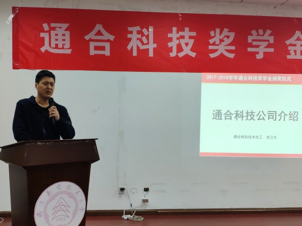 颁奖仪式后,通合科技公司现场进行了校园招聘宣讲,种晨光向现场的毕业生详细介绍了公司的人才招聘计划、人才发展和人员待遇等情况。