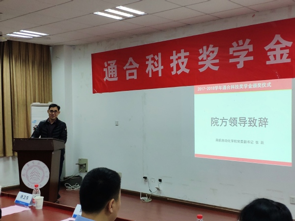 颁奖仪式由张跃致辞,他对通合科技公司对自动化学院人才培养的支持表示了感谢,他说,通合科技和自动化学院有着深厚的渊源,良好的合作。通合科技奖学金的设立更是为我校人才培养起到了有益的促进作用,希望学院与公司的深厚友谊能够长久的持续下去。