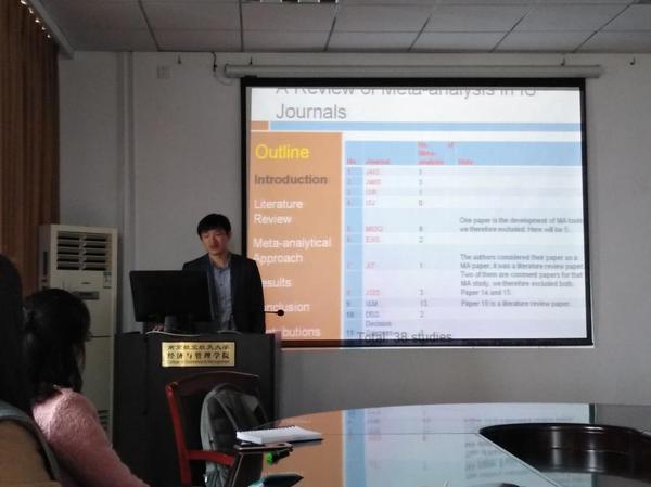 3月29日下午,西安电子科技大学牟健老师受经济与管理学院信息管理与电子商务研究所邀请,在经管楼706室做了题为“How to integrate meta-analysis and SEM to do IS research”的讲座。学院肖琳、刘丽丽、刘文龙、何昌清、宋连莲等教师及部分硕、博研究生现场聆听了牟老师的报告,本次学术讲座由肖琳老师主持。