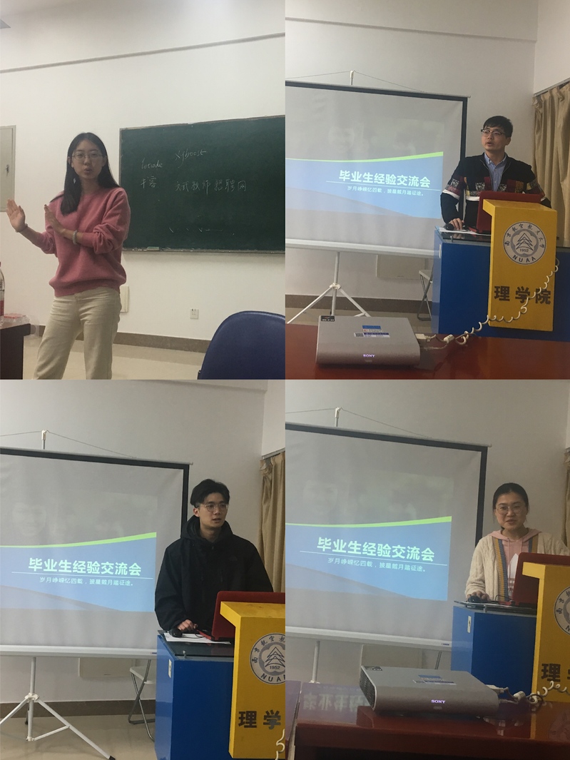 3月29日晚,理学院助“理”前行研究生生涯规划经验交流会在学院楼506会议室召开,本期交流会邀请了来自学院硕士研究生三年级的吴严生、刘鸿、贺斌心、马腾飞、陆东升和徐宁等6名优秀毕业生,与低年级同学一起面对面交流分享个人生涯规划故事。