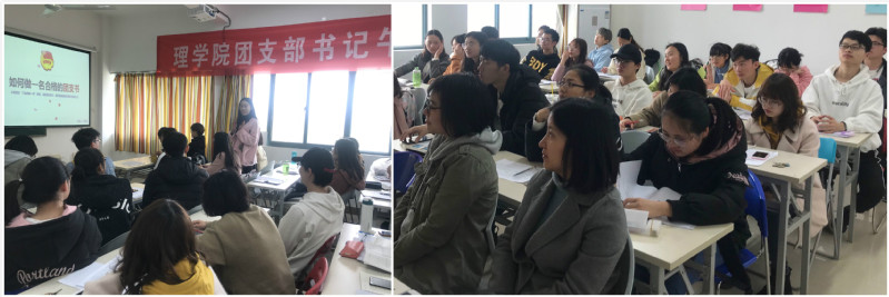 理学院团委书记欧珊从“理学院团支书工作清单”入手,结合新团章第二十四条的规定和理学院团委实际情况,细致解读了团支书工作的基本任务、重点任务、基础工作项和特色工作项,并结合学院高年级两名优秀团支书赵竟辰、张越的事例,对低年级团支书提出了“政治上要正确,作风上要扎实,品德上要高尚”的要求。2016、2017级本科生辅导员刘思佳结合自己学生时代做团支书的经历,分享了团支书苦与乐,并鼓励团支书们加强理论学习、心系广大青年,做一名有人格魅力的团支书。2018级本科生辅导员胡诗帆从是什么、为什么、怎么做三个问题入手,重点讲解了支部特色项目如何做,和团支书们分享了“早”、“长”、“亮”三个关键字,希望各支部对于特色项目能早做谋划、长期坚持、做出亮点。