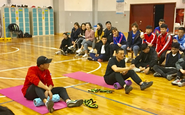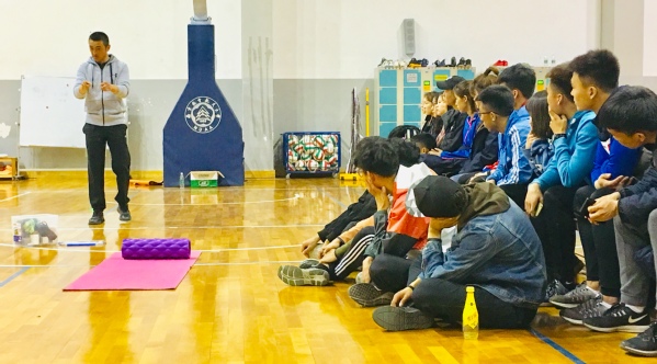 讲座中,王胜从需求出发、注重实践,针对我校学生、运动员进行有关预防运动损伤、运动前绑扎与保护、运动后的恢复与再生三个主题的实践讲解和现场指导,系统科学的讲述指导加以运动队队员的参与演示,让两个小时的讲座现场氛围热烈。男篮队员们刚结束比赛,就立马赶到现场学习并积极参与膝关节运动损伤绑扎的示范。