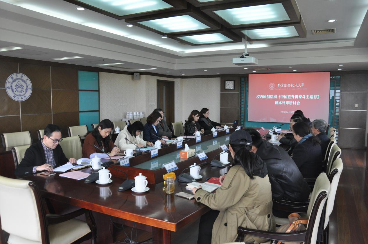 4月4日上午,我校原创话剧《中国直升机泰斗王适存》剧本评审研讨会在明故宫校区综合楼820会议室召开。校党委常委、宣传部部长王晖,省文艺精品专家评委、原省文化厅艺术处处长方同德,南京大学艺术文化研究所所长、教育部艺术教育委员会委员康尔,我校航空学院党委书记冯绍红,航空学院教授、王适存教授学生徐国华,科协秘书长刘双丽,发展研究中心副主任孔令华,话剧主创人员参加研讨会。研讨会由党委宣传部副部长王静主持。