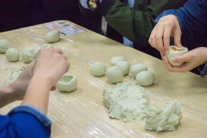 从揉搓面团到填入馅料,再到包裹塑形,虽然不少同学都是第一次动手,但是同学们都在不断探索其中的诀窍,努力尝试。很快,上百个肉松馅和豆沙馅的青团就从同学们的手中诞生了。