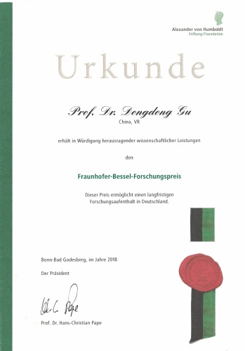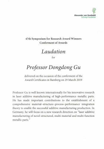 洪堡基金会研究奖面向德国以外的全球科学家,专门授予和表彰在基础研究、理论创新、学科引领等方面上取得优异成绩的外国学者。洪堡基金会在颁奖辞中指出,顾冬冬教授是增材制造领域国际知名学者,在高性能金属构件激光增材制造领域开展了创新研究工作。他为建立增材制造材料-结构-工艺-性能一体化理论、成功实现增材制造加工做出了重要贡献。顾冬冬教授将基于中德合作持续聚焦新结构、多材料及多功能金属构件激光增材制造研究。