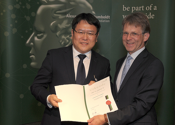 洪堡基金会主席Hans-Christian Pape教授向顾冬冬教授颁发了获奖证书,并合影留念。来自美国、英国、法国、加拿大、意大利、日本、韩国等国的获奖者参加了颁奖仪式,顾冬冬教授是参会代表中唯一一名来自中国的获奖者。