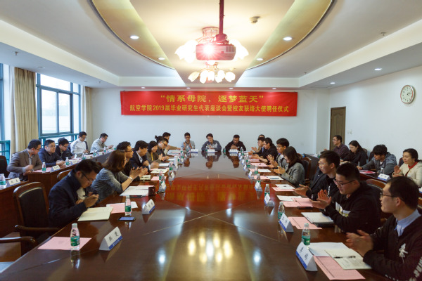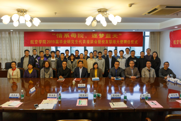 4月9日下午,“情系母院,逐梦蓝天”航空学院2019届毕业研究生代表座谈会暨校友联络大使聘任仪式在18号楼511会议室召开。院党委书记冯绍红、院长高存法、研究生院副院长郑祥明、院党委副书记许静、副院长魏小辉,各系所教师代表,学工办、教学办、校友联络办老师以及毕业生代表参加了此次座谈,座谈会由许静主持。