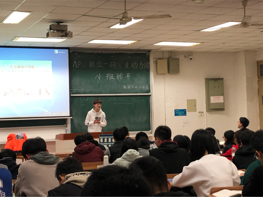 4月10日,能源与动力学院 “APU联盟——研究生助力团”学业辅导班第一期顺利举行。本次学业辅导班由学院“APU联盟-研究生助力团”成员之一,2018级研究生刘子赫,为学院150余名低年级本科生开展重难点课程《高等数学》的辅导。