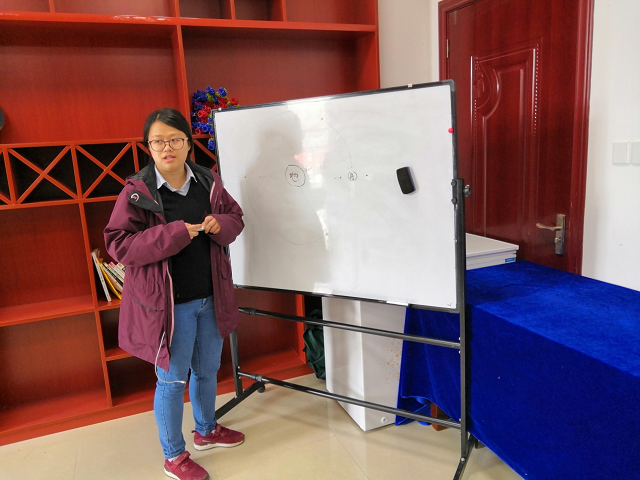 活动伊始,高珊为同学们详细介绍了她在学校的学习经历以及进入501所从事轨道设计工作的心路历程。讲述到嫦娥四号轨道设计时,高珊为同学们进行了现场授课,利用白板画出了中继星“鹊桥”所处位置,解释了轨道设计的目标、关键以及难点。随后,韩艳铧进行补充,他高度肯定了高珊同学目前取得的工作成就,希望同学们能够向她学习。