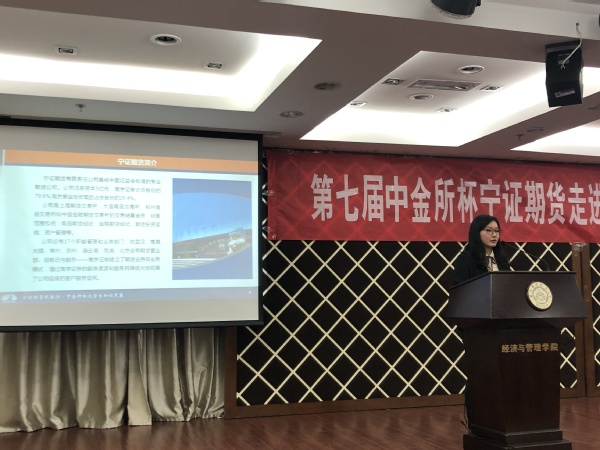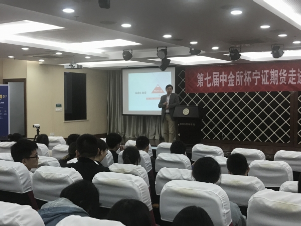 4月15日晚,经济与管理学院联合宁证期货举办的第七届“中金所杯” 金融衍生品知识大赛宣讲会在学院A0305报告厅举行。经济系教授段进东、宁证期货电商运营中心王希丹、学院团委书记庞依达和百余名同学共同参加了此次活动。
