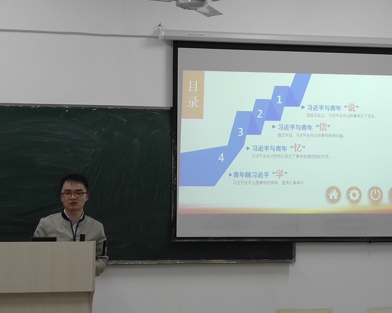 在“习近平与青年‘说’”部分,沈晓海介绍了习近平总书记通过座谈会与各界青年对话,从对话人的身份、时间节点等因素分析了总书记的关切所在,与同学们分享了对“爱国、励志、求真、力行”的理解。在“习近平与青年‘信’部分,沈晓海选取了习近平总书记分别写给大学生、创业团队、青年志愿者、海外学子、大学生村官等各界青年的回信,提取其中的“梦想”、“奋斗”等关键词,鼓励大家响应习近平总书记号召,争做优秀青年。在“习近平与青年‘忆’”部分,沈晓海通过截取的新闻片段,讲述了习近平总书记与各界青年一起回忆五四百年和留法百年的情况,他认为这些都说明了青年是重要历史时刻的创造者,鼓励在座同学们成为和谐社会和全面小康的有力促进者以及创新中国和和谐社会的热情实干者。最后,在“青年随习近平‘学’”部分,沈晓海希望大家学科学理论,做有理想的人;学专业知识,做有本领的人;学奋斗精神,做有担当的人。