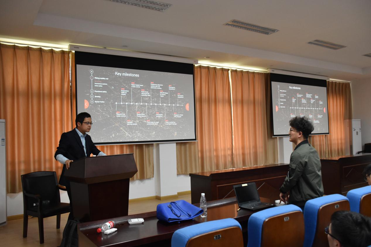 韩静瑞为同学们介绍了自动驾驶之旅的解决方案,从研发角度详细讲解了如何从主动安全、自动驾驶、用户体验和互联服务四个模块开发更安全、更环保、更互联的未来出行工具。同时他结合自身的职场轨迹和行业前景,帮助同学们开展职场定位,定制职业生涯规划。