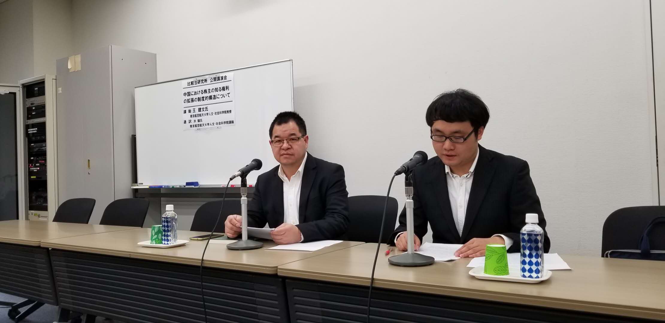 在早稻田大学比较法研究所与法学部的共同安排下,王建文作了题为“论我国股东知情权穿越的制度构造”的学术报告。整个报告持续了近两个小时,早稻田大学法学学术院师生聆听了讲座,甚至还有俄罗斯大使馆的相关人员也慕名而来。在答疑互动阶段,日方学者就中日两国现行公司法在制度设计上的差异提出了非常棘手与专业的问题,王建文从社会背景、立法目的、司法实践等多个角度切入,详尽细致地给出了合理解答,赢得了热烈的掌声。会上,洪骥老师全程承担了报告与答疑的翻译工作。