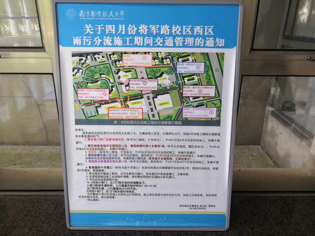 为进一步促进工作精准化程度,确保形成畅通、积极的沟通和响应机制,校区管委会会同相关单位进行现场协调,在雨污分流每一个工段开挖前就交通线路、网络分布、绿植移栽等问题确定具体方案;在每个月制定交通出行方案,在学校办公网、驻区单位工作群及时发布,并在图书馆、教学楼、学生宿舍、学院楼、食堂等处放置交通安全引导通知;同时,校区管委会党政领导和工作人员加大施工现场巡查频次,召开安全工作专项协调会,对可能影响师生出行、造成安全隐患的问题即时督促整改。