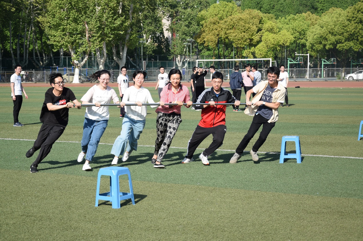 跳长绳作为趣味运动会的传统项目,大家可谓经验丰富,摇绳的同学抓稳节奏,老师与同学们配合默契、行云流水。一根小小的跳绳,连接的是团结与信任,传递的是精神与力量,演绎的是奋斗与拼搏。持杆蛇形跑比赛,充分展示了学院师生的“专业”水平。从人员的站位分配、到每位选手的速度控制与转弯动作,每一个微小细节都饱含了力学原理。更有同学称此为“大型受力分析现场”。呼啦圈过山车既是一项讲究技巧的游戏,又是一项检验成员团结协作能力的比赛,11位选手手拉手、面对面看着大家婀娜多姿的体态,欢呼声与呼啦圈齐飞中赛事达到了高潮。