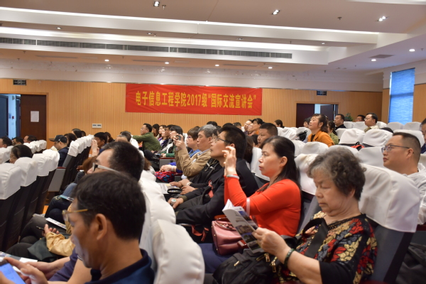 与此同时,2017级国际交流宣讲会也在学院515报告厅火热进行中。宣讲会雷磊主持,由李勇老师主讲,李老师对国际交流项目进行了具体介绍,近百名家长对于国际交流有了新的认识和了解。当天下午,学院还为家长们精心准备了“礼赞新中国,唱响新时代”红歌会和素质能力悦享会,进一步展现学生的青春与活力。