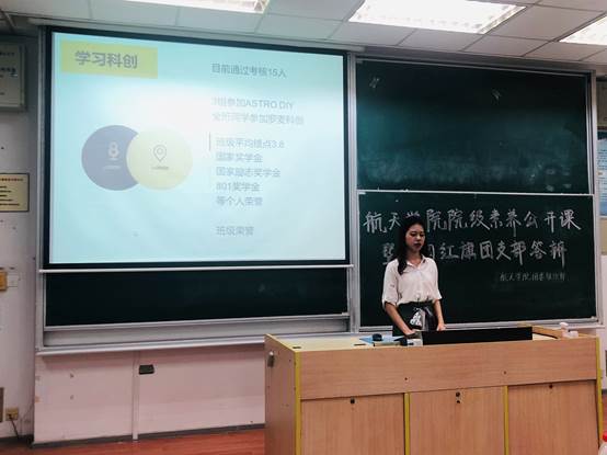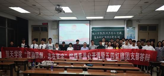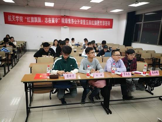 4月21日晚,航天学院“红旗飘飘,志在寰宇”院级素养公开课暨五四红旗团支部答辩活动在将军路校区6403教室举行。航天学院团委指导老师管永星,17级本科生辅导员王碰,航天学院团委副书记范仕峣、学生会副主席胥新宇,以及航天学院17、18级各支部班长团支书参加了本次活动。