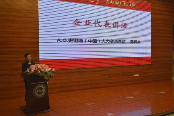 万众支持,职途未来,校企协同形成合力助力人才培养。长期以来,学院与社会各界一直保持密切联系,重视校企合作,拓展育人力量。目前,机电学院拥有昌飞、成飞、沈飞、汉中零组件及A.O.史密斯菁英社等5个校企俱乐部。其中成飞俱乐部成员朱春润作为代表讲述了他的科研故事,介绍了在成飞公司的实地调研,分享了在项目完成过程中的思考与感悟,激励更多机电学子加入校企俱乐部,将理论知识与实际生产情况相结合,为祖国的航空事业贡献青春力量。随后,其他4个校企俱乐部也形式各异地展示了学院校企俱乐部的风采。紧接着,A.O.史密斯(中国)人力资源总监郑师文作为企业代表发表讲话,她通过一组数据回顾了A.O.史密斯与南航的合作历程,对机电学子给予了高度的肯定和赞扬,表示未来欢迎更多的机电学子加入A.O.史密斯,还将进一步深化校企合作,通过多元化的渠道和措施助力我校人才培养。