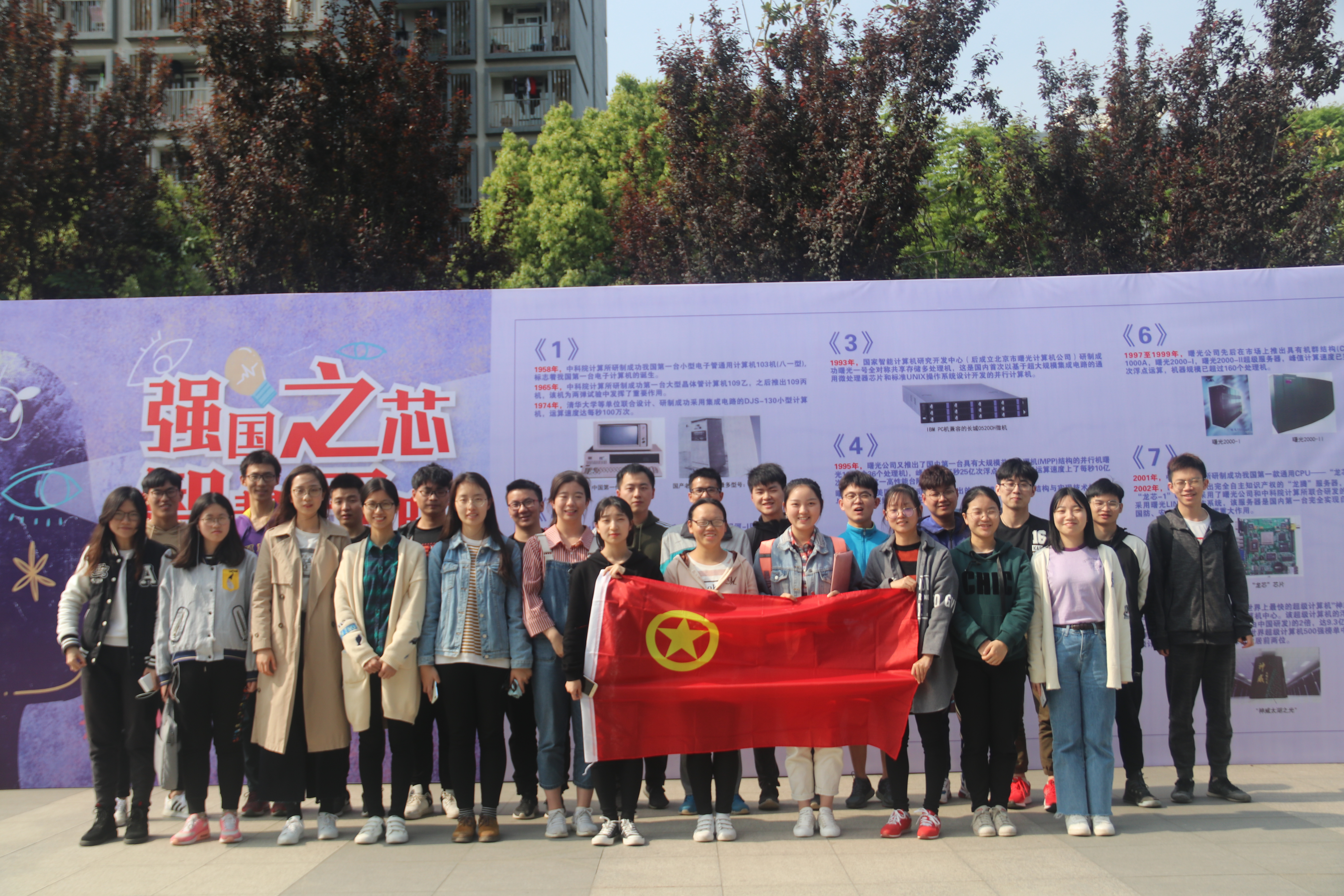 活动现场还通过喷绘展示了建国70年我国计算机信息技术的发展与革新,将信息科技的发展脉络与社会的经济发展结合起来,以计算机技术为一个切面,呈现出伟大祖国70年波澜壮阔的社会发展。
