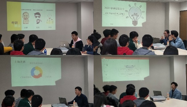 随后四位主讲人依次上台分享经验。罗润彬同学认为“考研=信息战”,他认为考研信息的收集是至关重要的,并给同学们分享一些常用的网站和APP。何漫丽同学则结合自己的学习情况,向同学们讲述了自己跨专业考研的过程。建议同学们要提前开始高数、英语科目的复习。黄旭辰同学则是从考研的几个重要阶段进行经验分享,他强调在考研的过程中,需要根据复习的情况进行心态、方法的自我调节。朱中原同学从考研学校以及专业的选择出发,详细介绍了他在选择院校过程中的经历,他指出“选择比努力更重要”,提醒同学们结合自身特点做好考研前的准备工作。