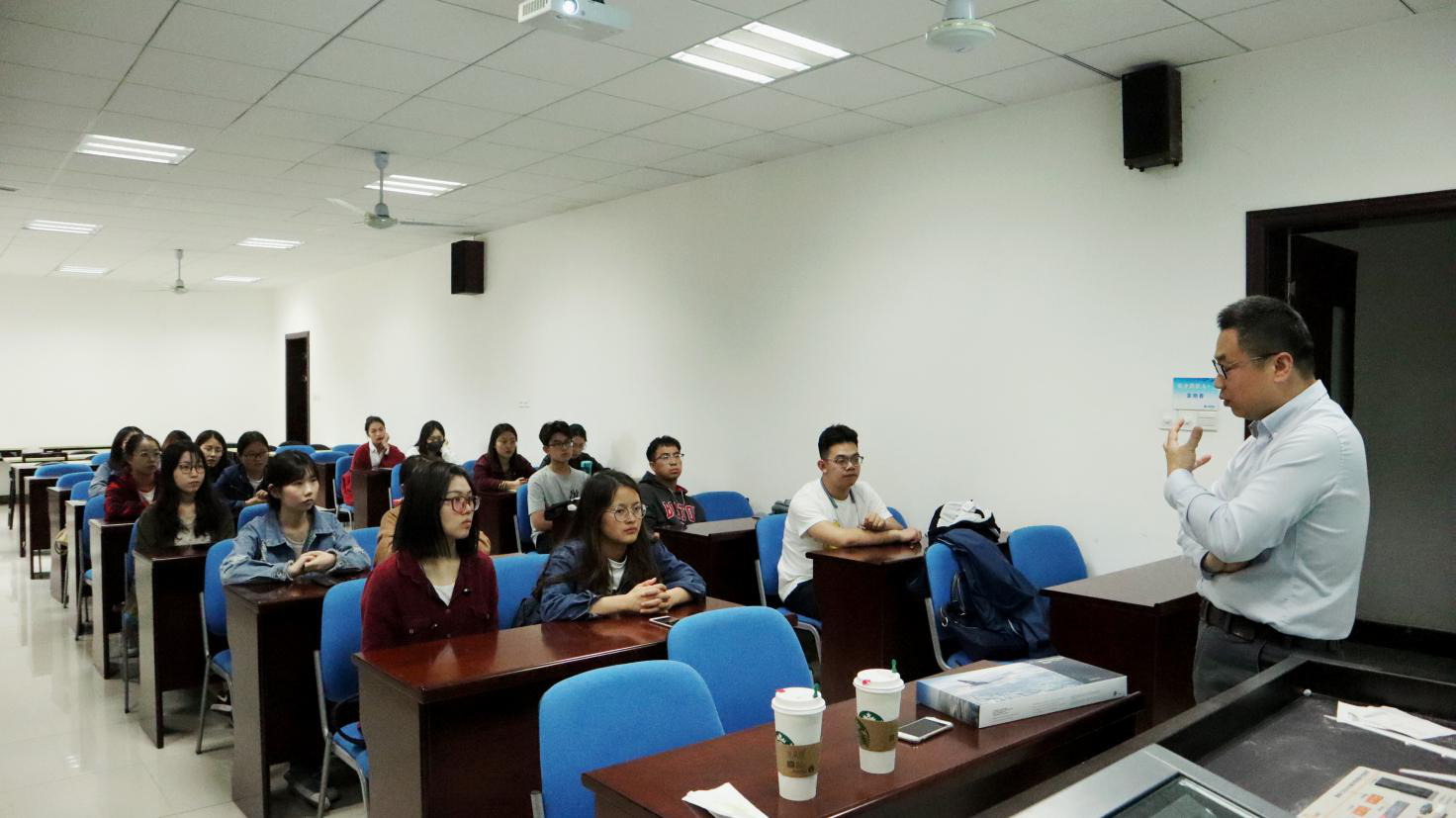 田超纲介绍了德国汉莎货运航空公司的具体情况,然后对客运航空行业和物流行业的形势进行分析。他建议同学们要做好相关领域的知识储备,就业时有的放矢,把握航空行业的人才需求。此外,田经理结合自身多年在不同岗位历练的经验,对外国语学院的学生在日常学习、生活以及毕业后职业规划、发展等方面提出了许多建设性建议,他指出企业面试时看重学习能力、实习经历及自我评价等。最后,他强调青年学生要充分利用大学资源,在积淀自己专业素质的同时也要拓宽视野、多维发展。