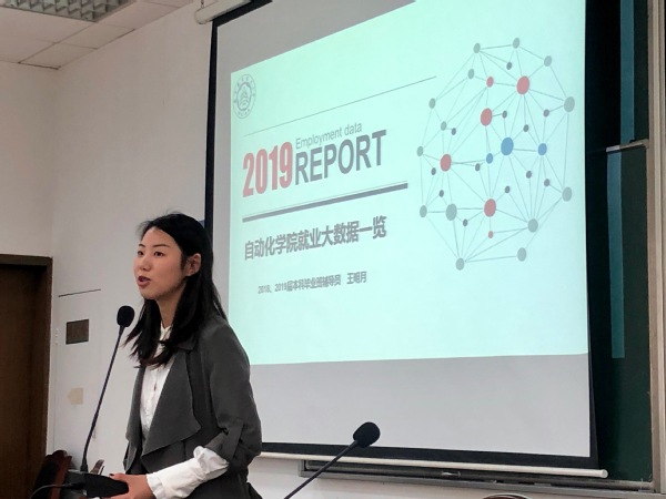 发布会后,王明月带来自动化学院就业大数据分享。王明月从“就业的概念”、“就业的现状”和“应对的方法”三个方面以及学校、学院两个层面为同学们分享了就业大数据,让同学们对就业有了更清晰的认识,并指出了毕业生常见的一些就业误区,鼓励同学们积极了解就业信息、努力提升就业能力。