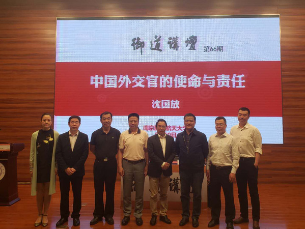 5月10日,第66期御道讲坛在将军路校区一号楼四楼报告厅举行。外交部新闻司原司长、外交部前发言人、中国前驻联合国大使沈国放先生应邀来我校,作了题为“中国外交官的使命与责任”的讲座。中航技进出口有限责任公司党委副书记唐建明、人力资源部部长唐星、人力资源部主管李钧,原总参军谊出版社社长、驻东帝汶使馆武官邵宁,外国语学院院长范祥涛、副院长徐以中、党委副书记梁薇出席此次讲座。