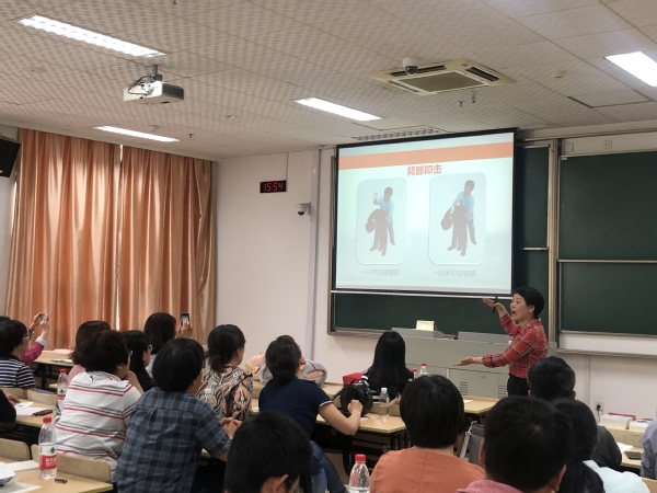 课堂上,张霞老师通过播放视频、现场模拟示范等方式,重点讲解了现代救护新概念、心跳、呼吸骤停的现场急救理论—心肺复苏术、除颤仪的使用、创伤救护的基本理论、气道异物梗塞的判断、现场救护技术等急救知识;指导全体学员进行心肺复苏实操演练,对每一个操作步骤进行了详细的演示,如按压频率,按压幅度,施救次数等;还讲述了止血、包扎、固定、搬运等基本技能,要求每一位学员进行三角巾法、绷带法、止血带法等包扎止血方式的实操训练。