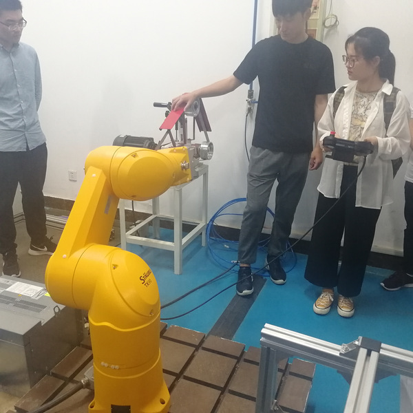 紧接着实验室向同学们介绍并展示了六自由度多功能末端执行器,从工作原理,到能实现的各项功能,做了完整了阐述,并对其误差产生和解决方法做出详细说明。简要介绍了机器人绝对定位精度补偿。演示环节,学长亲自操作机器人演示其工作过程,引发了同学们的共鸣。更有同学亲身体验了一些简单的操作。