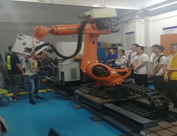 随后,实验室的研究生向同学们介绍了一台用于涡轮叶片打磨的六自由度智能机器人,利用笛卡尔坐标系配合高精度补偿机制精确定位,对于具有高精度要求的航空工业零件进行加工。演示环节,同学们积极参加,超过半数的同学亲身体验了智能机器人的操控。