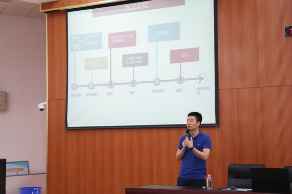 田崇伟以从事人力资源工作十多年的招聘经验,向同学们介绍了企业招聘的全过程,并且详细阐述了宣讲会、面试等环节中如何让求职者脱颖而出的技巧。在大部分同学已经做好自己简历的初稿的基础上,田崇伟从招聘者的角度,告诉同学们招聘人员最关注简历中的哪些板块,鼓励大家提高自己的学习成绩,丰富自己的实习与项目经验。同时,详细介绍了面试前如何做好资料、着装和自我介绍的准备,以及几大类面试的技巧说明,同学们从中收获颇丰。