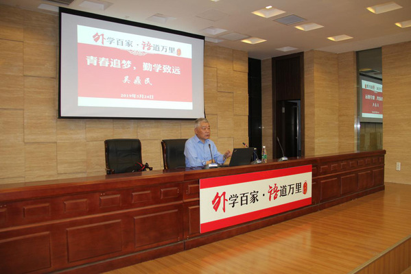 讲座伊始,吴鼎民介绍了外国语学院的发展历史,以自己的亲身经历为切入点,向同学们说明了专业的建设离不开国家的建设与发展,个人的发展亦是如此。大学生正值青春年华,个人梦想要与时代发展和祖国建设的需要相一致,为实现中国梦尽一份力量。接下来,他向同学们介绍了外语专业,以及学院对外语人才的培养要求,通过往届毕业生的实例,向同学们强调了专业基础的重要性,增强了同学们的专业认同感。最后,他对未来提出了展望,表示外语是一种与国外交流的工具,作为外国语学院的学生,大家要在了解外国文化的同时无忘中国文化,这样才能更好地发展跨文化交流能力。