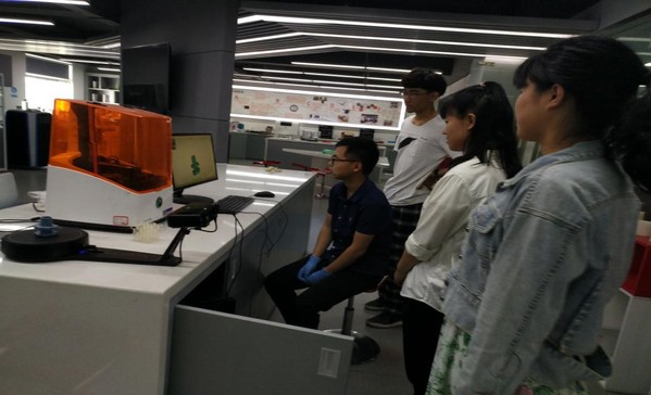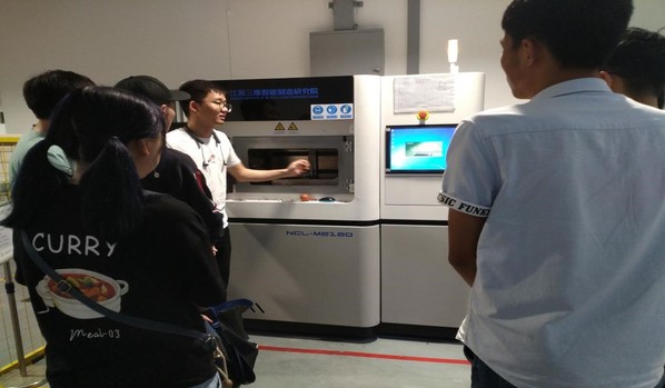 在进入实验室之前,负责本次参观行程的研究生焦晨同学向大家简单介绍了要参观的四个项目,分别是金属打印技术,陶瓷打印技术,电火花线切割技术以及光敏固化技术。参观人员分成四个组分别参观各自感兴趣的内容,本期的参观内容主要围绕3D打印技术展开。