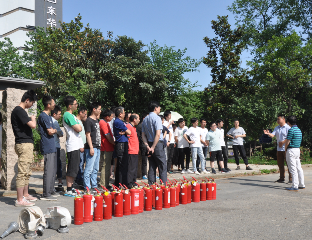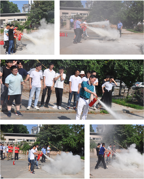 陈斌老师现场向参训人员介绍了灭火器的用途、性能、原理和操作方法。用“提、拔、瞄、压” 四字原则当场进行示范:首先将灭火器提起晃动几下瓶身,使瓶内干粉松动,然后拔下保险销,瞄准火焰根部,压下压把喷射,直至火焰熄灭。