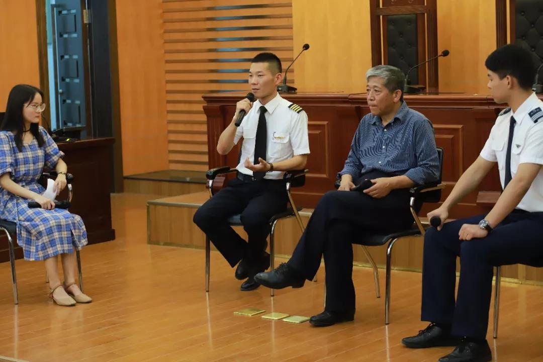 在访谈和互动环节,同学们踊跃提问,三位嘉宾分别就各自的问题做出了精彩的回答。张学财讲述了自己来到南航继续从事飞行相关工作的初衷,比起航空公司的百万年薪,他说更看重的是能够在学校培养飞行员、做与飞行有关的事。马保利谈到有关淡泊名利精神的传承问题,寄语学弟学妹们人生不能功利。姚俊杰分析了自己有关飞行员应具备的能力与素质的理解,提出学好英语的重要性。