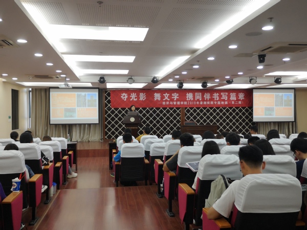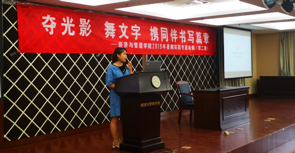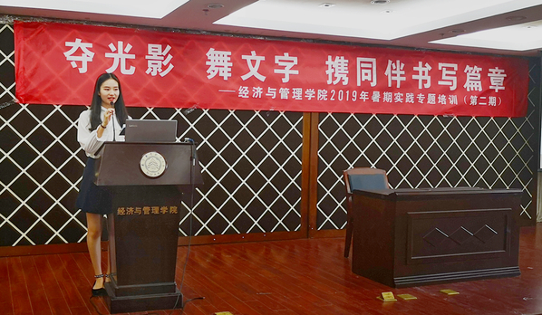 6月12号下午,“夺光影 舞文字 携同伴书写篇章”经济与管理学院第二期暑期社会实践专题培训在经管楼报告厅顺利举办。经管学院宣传员时云、辅导员朱一豪、新媒体中心邵丹惠分别就摄影摄像、团队运营和新闻撰写开展了专题培训,学院团委书记庞依达和近两百余名社会实践项目负责人参加此次学习。