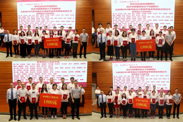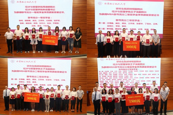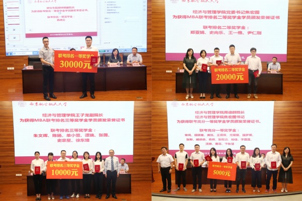 南京航空航天大学研究生院副院长郑祥明宣读获得2019级MBA奖学金名单,本次奖学金项目设置联考排名奖学金和联考高分奖学金。郑祥明、周德群、焦宏图、王子龙等分别为获奖同学颁奖。