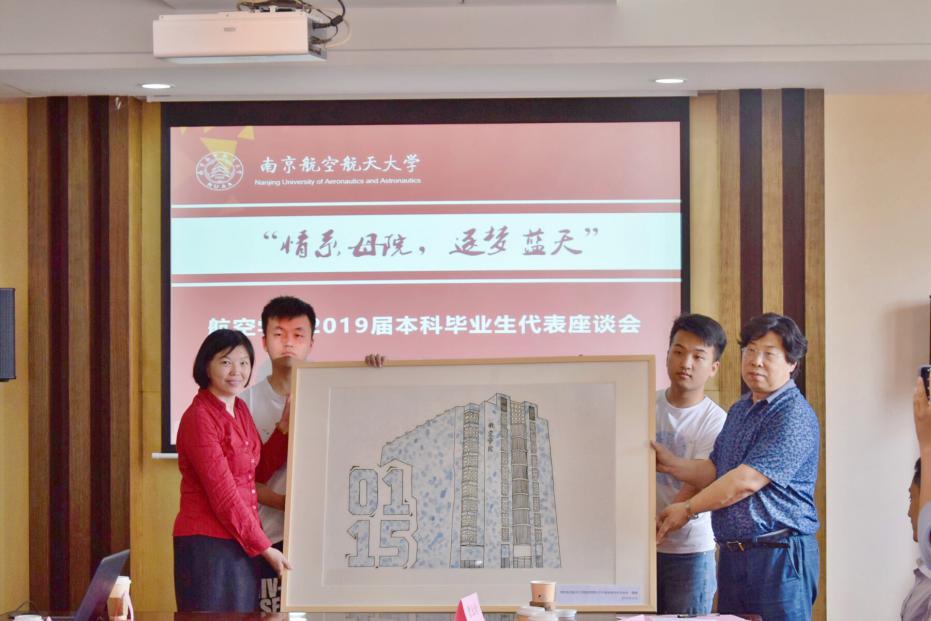 毕业生献礼环节将座谈会的热烈氛围推向高潮,由2019届全体本科毕业生手印印制成的学院大楼,祝福母院在全体师生的努力下,建设成为世界一流航空学院。冯绍红和高存法代表学院接受了献礼并表达了对全体毕业生的感谢。