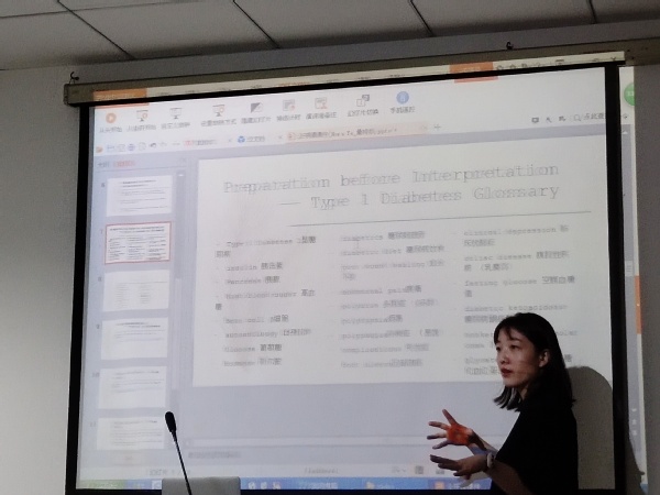 叶舻霆女士曾经担任昆山杜克大学校办翻译,拥有8年专业口译经验,也是医药翻译领域的专家。叶老师从糖尿病病人出院的场景翻译出发,具体地展示了口译译员的译前准备(如相关资料查找、术语整理等)。