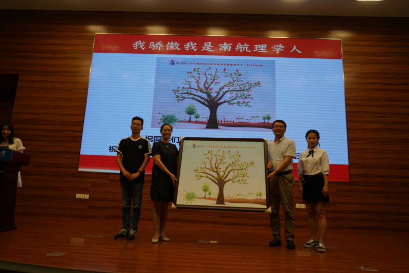 在即将离开母校之际,2019届全体毕业生也为学院准备了一份礼物,礼物采集了2019届本科119位同学的手指印,作为一个个小“李”(理)子,共同绘制了一张“桃李满天下”的图画送给学院,一方面寓意同学们学业有成,拥有美好未来,一方面祝福理学院培养出一批又一批的优秀人才,桃李满天下。随后,四位毕业生代表一起朗诵了原创诗歌《理学梦》,祝福所有师生。