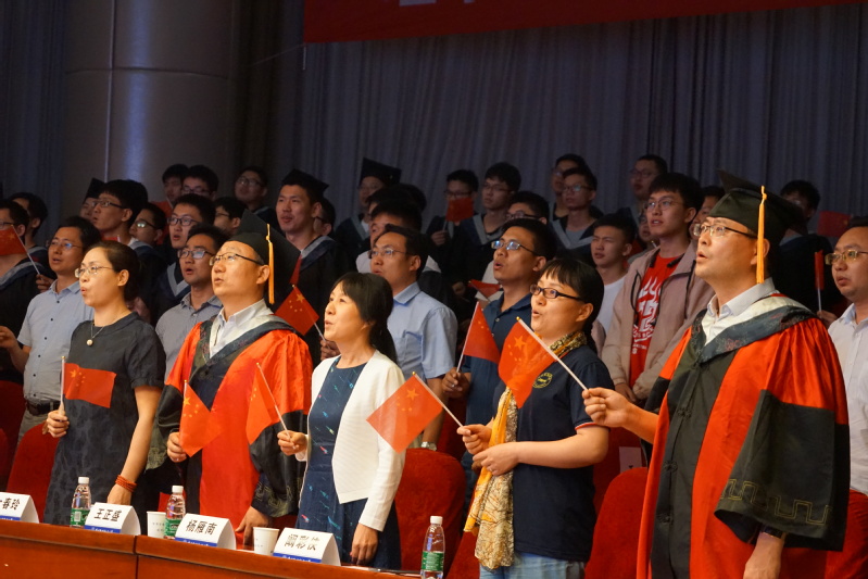 毕业典礼之后是隆重的学位授予仪式。王春武教授、王正盛教授、刘友文教授、李晋斌副教授为取得学士学位的同学逐一援正流苏,颁发学位证。在学位授予仪式进行期间,毕业生用拥抱、合影的方式表达了对导师的感激之情。学位授予仪式的尾声,全体师生起立,挥舞红旗共同唱响《歌唱祖国》,献礼伟大祖国建国70周年,开启新的征程!