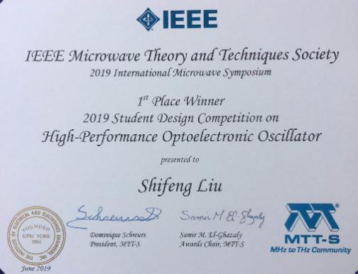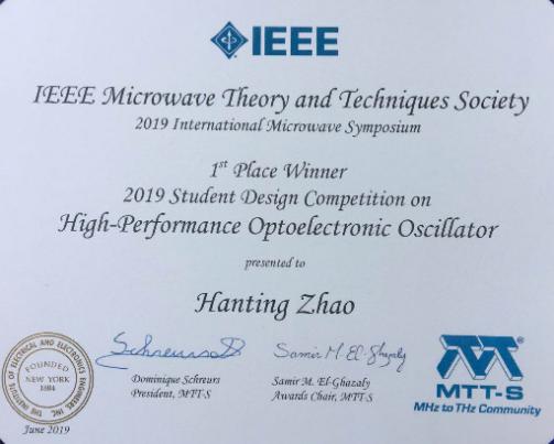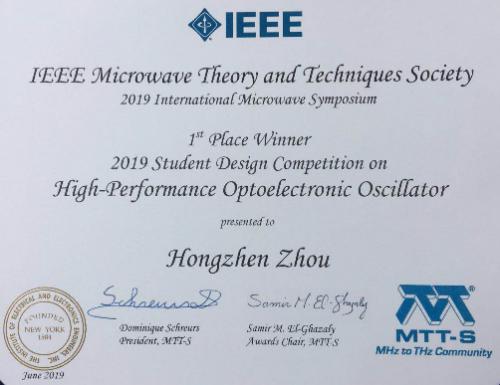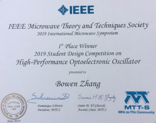 2019年6月4日,IEEE 微波理论与技术学会(MTT-S)一年一度的学生设计大赛在美国波士顿国际微波论坛(International microwave symposium)上举行。电子信息工程学院研究生团队(参赛选手:刘世锋、周泓臻、赵晗汀、张博文,指导老师:潘时龙教授)参赛,一举斩获了高性能光电振荡器(High-Performance Optoelectronic Oscillator)项目的第一名。此前我院研究生团队曾获得微波光子链路接收机(Microwave photonic link receiver)项目的第一名(2015年)和第二名(2016年)。