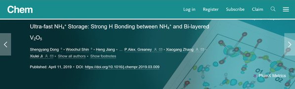 近日,我校材料科学与技术学院张校刚教授课题组与美国的俄勒冈州立大学、加州大学河滨分校、阿贡国家实验室等中美联合研究团队在超高功率储能器件方面取得重要研究进展。相关研究成果(Ultra-fast NH4+ Storage: Strong H Bonding between NH4+ and Bi-layered V2O5”)以我校为第一单位发表在《Cell》子刊《Chem》(化学类顶级期刊;IF=14.104)上,第一作者是我校材料科学与技术学院的博士研究生董升阳。