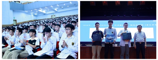施大宁在专题讲座中简要介绍了南航近年来的发展情况和学校在人才培养上为国家航空航天民航事业所作的贡献,让淮中同学对南航故事、南航文化有了更加直观的了解。讲座中,他从引力波的发现讲起,用通俗易懂、生动风趣的语言深入浅出地讲述抽象的引力学知识,娓娓道来科学家们探索神秘深邃宇宙的故事,给中学带来了一场科学大餐和文化盛宴,现场氛围热烈,师生们一次次报以掌声。讲座最后,施大宁与现场学生进行了亲切互动,对于学生提出的每一个问题都作出了耐心解答,并勉励学生勇于探索科学未知、关注空天科学,南航将为有志于长空的学生提供丰厚的成长土壤。
