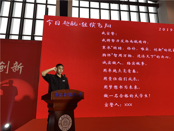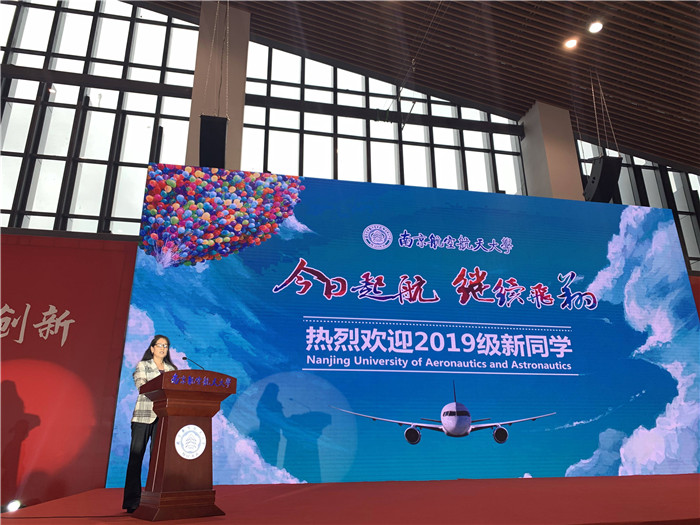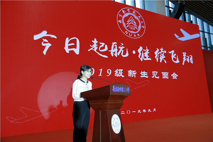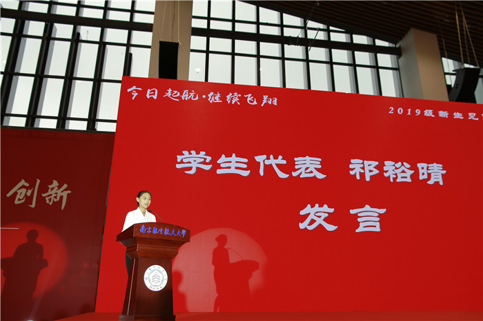 2019级祁裕晴作为新生代表发言,感谢南航为全体新生提供学习、成长的平台,表达了对未来大学生活的憧憬和努力学习、砥砺奋进的决心。