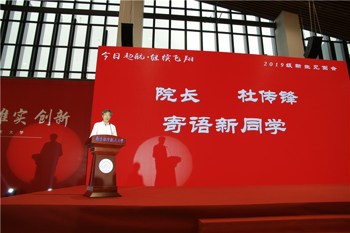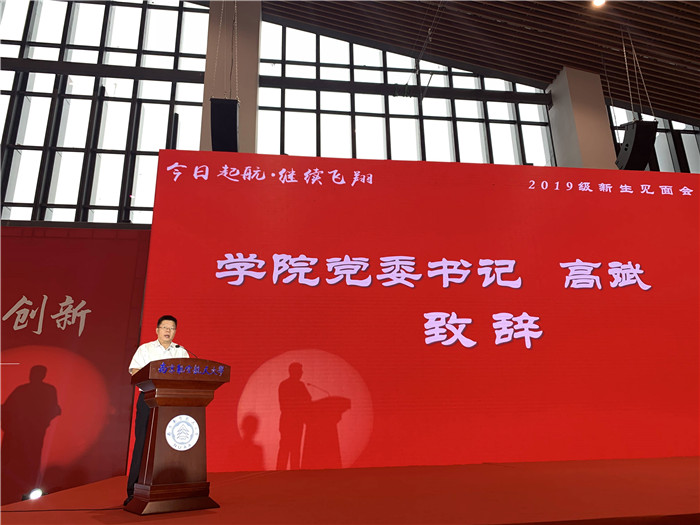 高斌致欢迎词,他从学校发展、师资力量、科研成果、教学环境等方面向全体新生介绍了学校以及天目湖校区的情况,从学院概况、项目设置、学院管理、人才培养等角度,为新生讲解了学院发展历程,并对新生加入南航大家庭表示了热烈欢迎,提出了殷切期望。