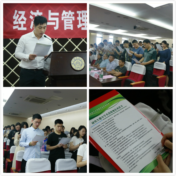 同时,2019级全体研究生在学院领导和老师们的见证下签订《南京航空航天大学经济与管理学院研究生学术道德规范承诺书》,全体新生宣誓做“严格遵守有关科学研究的规定和程序,努力成为优良学术道德的传承者和良好学术风气的维护者”。