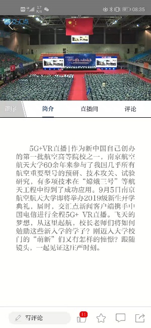 9月5日上午,南京航空航天大学2019级新生开学典礼正式举行。此次开学典礼,信息化处携手交汇点新闻、中国电信、中国移动在全国首次进行全程5G+ VR直播,用不同维度、个性化的直播方式,展现了南航莘莘学子饱满的精神面貌,记录了富有意义的 “开学第一课”。